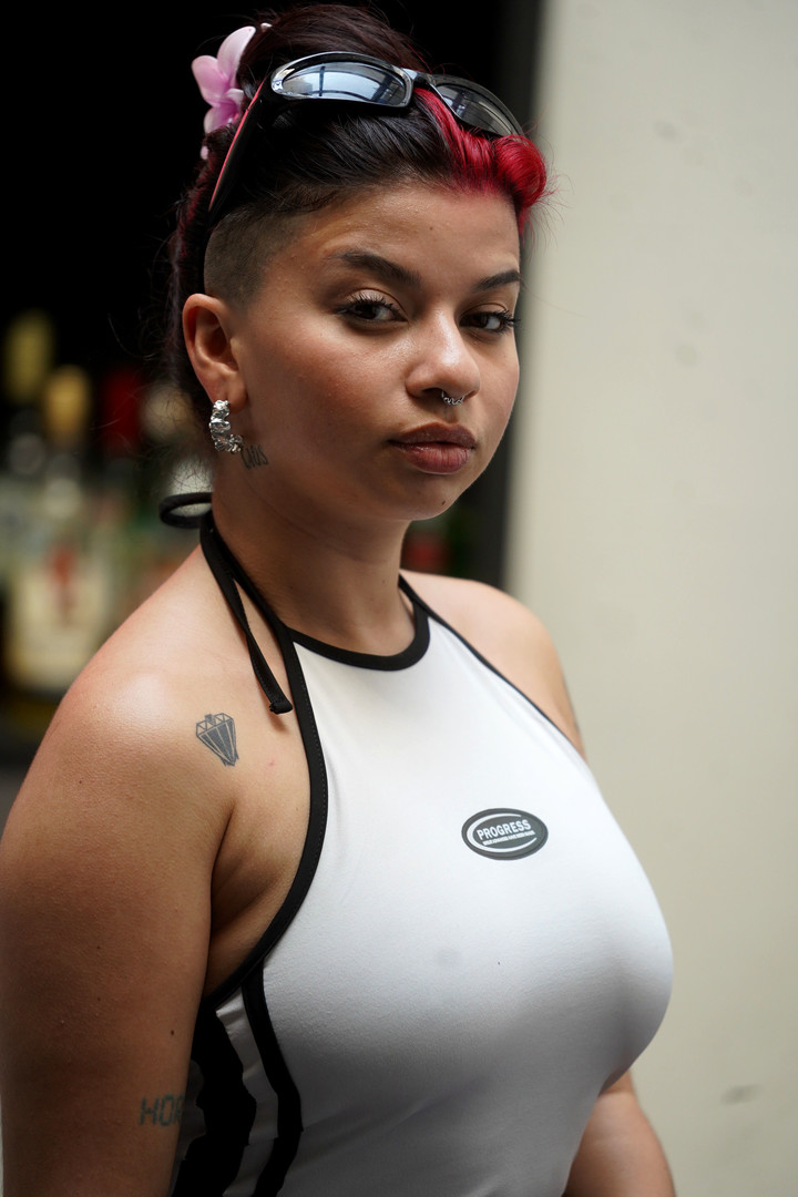 Candu Domínguez es de Merlo. De allí salió a las 4 de la mañana para llegar a Luzu, donde iba a estar Rosalía. Foto: Guillermo Rodríguez Adami -¿Qué pasa por la cabeza de una chica de 22 años que un día hace videos en TikTok y al otro graba con sus artistas preferidos, tiene miles de seguidores y hasta su ídola Rosalía pida escuchar su música?