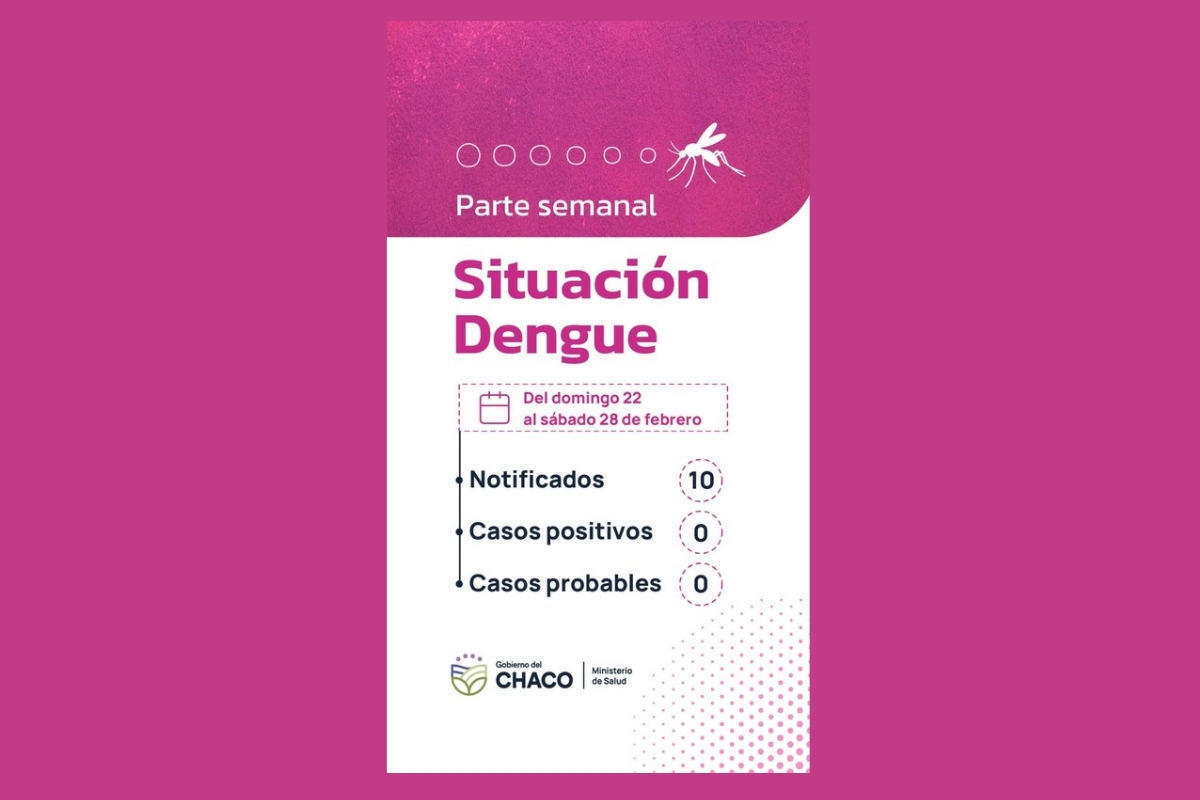 El Ministerio de Salud de la provincia informó que, durante la semana epidemiológica comprendida entre el domingo 22 y el sábado 28 de febrero, no se registraron casos positivos ni probables de Dengue en el territorio provincial.