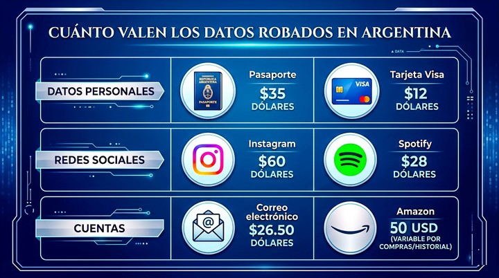 Así, una tarjeta de crédito argentina vale unos 12 dólares, un registro de conducir, 35, una cuenta de Disney+ baja a 7,25, la de X está menos de 6, un perfil de TikTok trepa a 60, mientras Binance llega a los 160, según datos de NordVPN y NordStellar. Estas cifras reflejan otra lógica: la sencillez para obtener esta información, termina depreciando su valor y amplía su circulación en mercados ilegales.