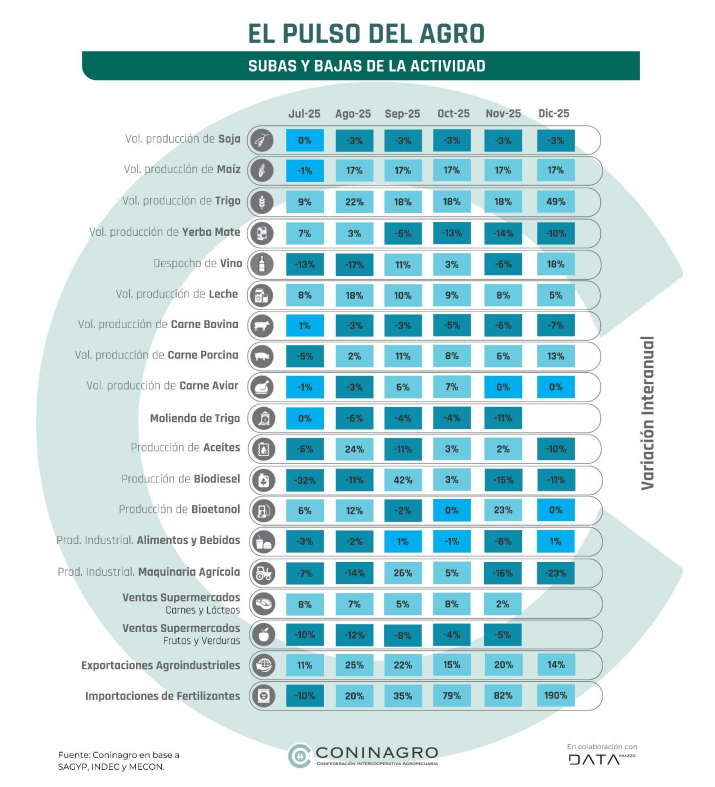 La Confederación Intercooperativa Agropecuaria (Coninagro) publicó una nueva edición de su informe mensual denominado “El Pulso del Agro”, en el que analiza 19 variables de actividad económica agropecuaria y agroindustrial.