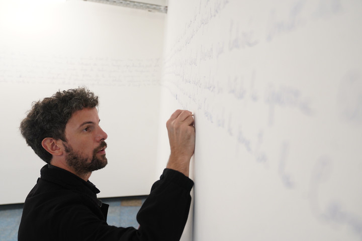 Nazareno Pereyra, primer residente de esta nueva etapa de PROA21, trabaja en los muros de la planta baja. (Foto: Guillermo Rodríguez Adami).Allí ya trabaja el primer artista invitado, Nazareno Pereyra, en una obra que cubrirá las paredes de la planta baja con un texto en lápiz azul Francia: No podemos permitir que la inteligencia artificial escriba nuestros poemas, tal el título de su proyecto, es un relato contemplativo y narrativo que registra en cuadernos su camino en tren y colectivo hasta La Boca. Esta suerte de proceso de diario íntimo surgió a partir de una inquietud de Lucie para profundizar sobre los textos que aparecen en sus trabajos visuales.