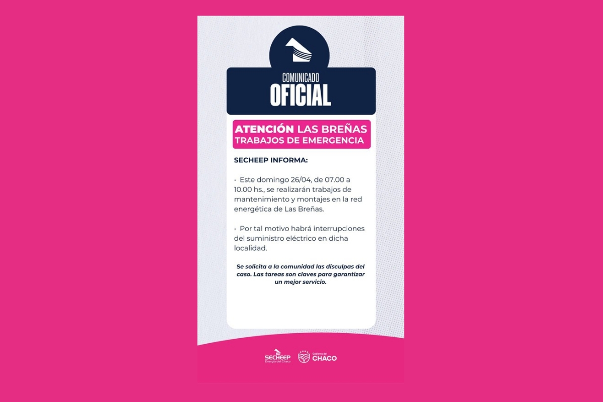 La empresa Secheep informó que este domingo 26 de abril, en el horario de 07.00 a 10.00, se llevarán a cabo trabajos de mantenimiento y montaje en la red energética, de la ciudad de Las Breñas.