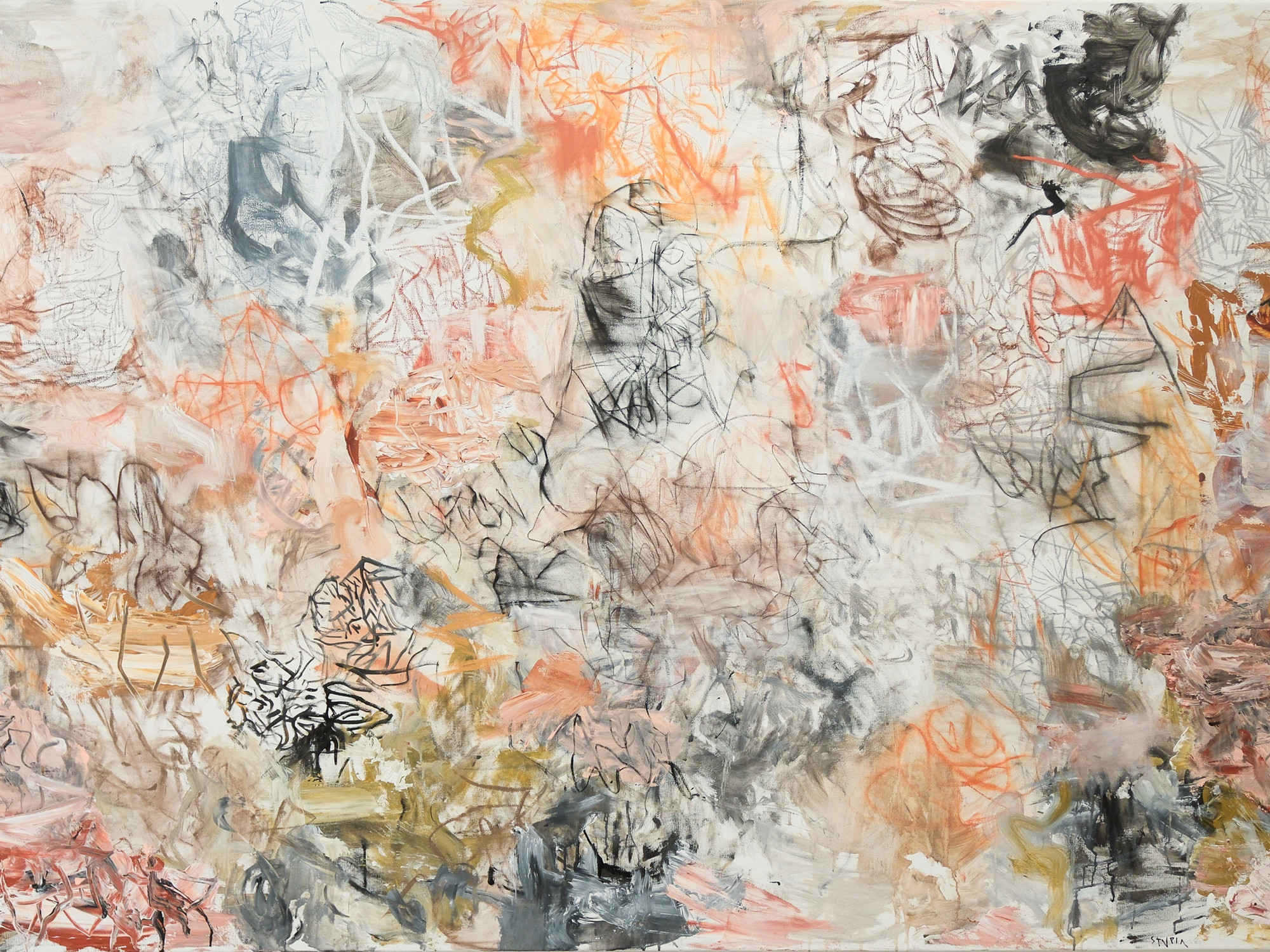 Stupía se abstrae y ensaya la abstracción jeroglífica, coloridamente hermética, de un panorama populoso de Brueghel o Carpaccio. La versión pictórica de la composición de átomos -rienda corta para protones, neutrones y electrones- le da la bienvenida al horror vacui y aflora cine primigenio. Una reserva de energía produce borradores para una y otra figura serpentinata. Viboreos cortos, registros sísmicos, contrastes y compensaciones que delimitan intervalos: formas al servicio de un espíritu para el restablecimiento del orden mental (para el pintor y en no menor medida para el espectador). Pintura primitiva y fresca, reciénvenida.
