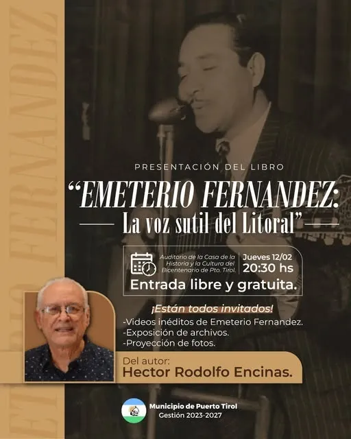 El Municipio de Puerto Tirol invita a la comunidad a participar de la presentación del libro «Emeterio Fernández: la voz sutil del Litoral», una obra del autor Héctor Rodolfo Encinas que recupera y pone en valor el legado artístico de Emeterio Fernández, uno de los referentes culturales más importantes de la localidad y de la región.