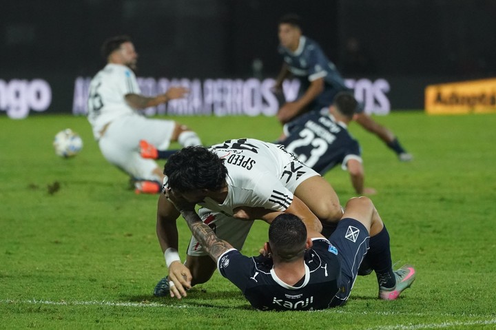 El partido que Deportivo Riestra le ganó 2 a 0 a Independiente en el estadio Guillermo Laza tuvo una disputa bastante extraña. La pelota continuaba en juego y dos futbolistas, Gonzalo Flores, del Malevo, y Facundo Zabala, del Rojo, se agarraron fuerte y la siguieron desde el piso. El referí, Luis Lobo Medina, no se percató hasta el final, y resolvió con una amonestación a cada uno.